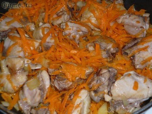 Тушим под крышкой ок.25 мин. до полной мягкости курицы.