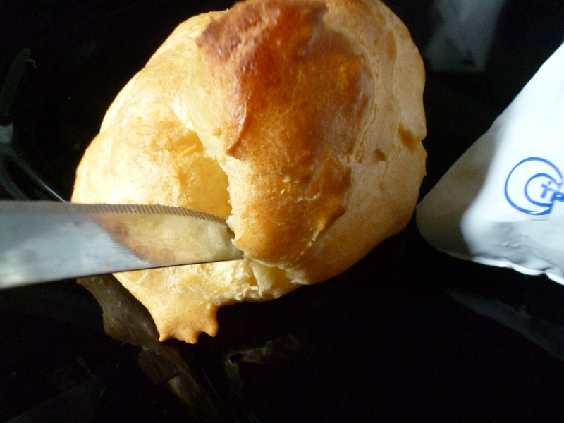 Для наполнения «Шу» кремом иногда полностью срезают верхушку, а затем укладывают её на крем сверху.