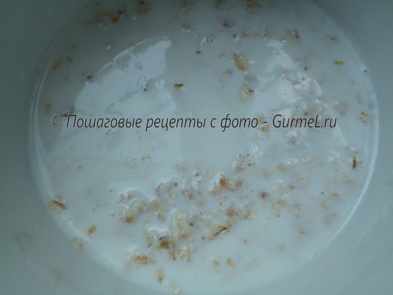 Овсяные хлопья залить молоком и оставить примерно на полчаса.