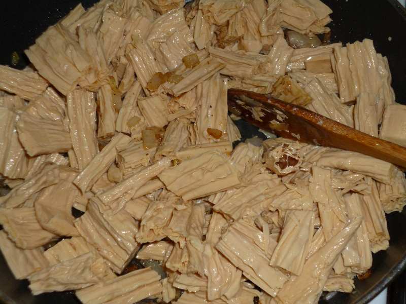 Луковицу слегка обжрить, добавить кориандр, перец, раздавленный в прессе чеснок, соевый соус. Перемешать.