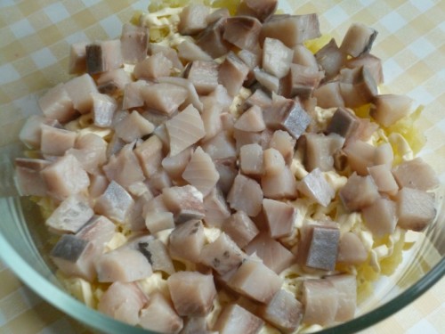 Лук и селёдку нарежем кубиками.