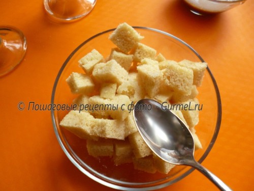 Бисквит охладить и нарезать кусочками, пропитать сиропом.